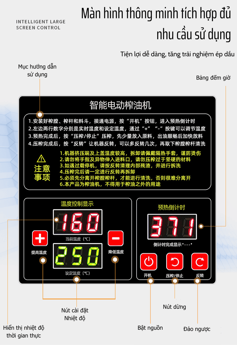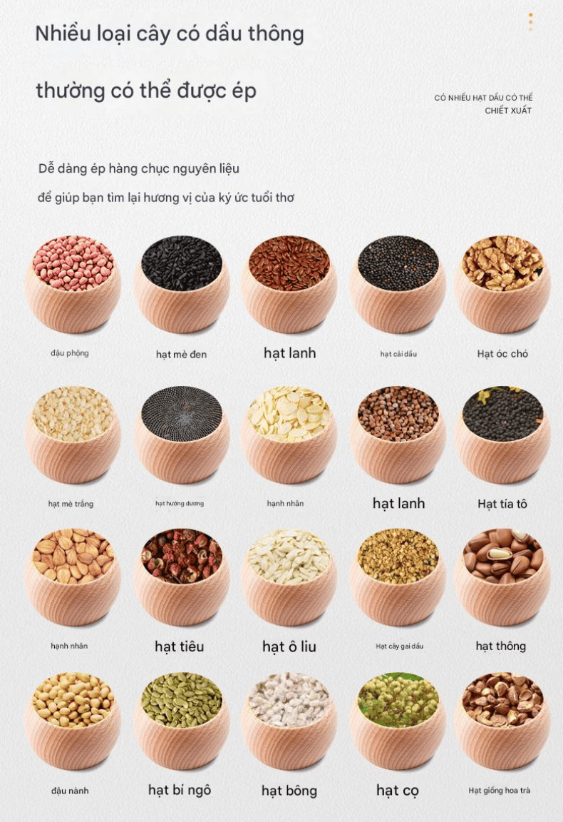 Điều chỉnh nhiệt độ linh hoạt (40–300°C) cho từng loại hạt, giúp tăng hiệu suất tách dầu.