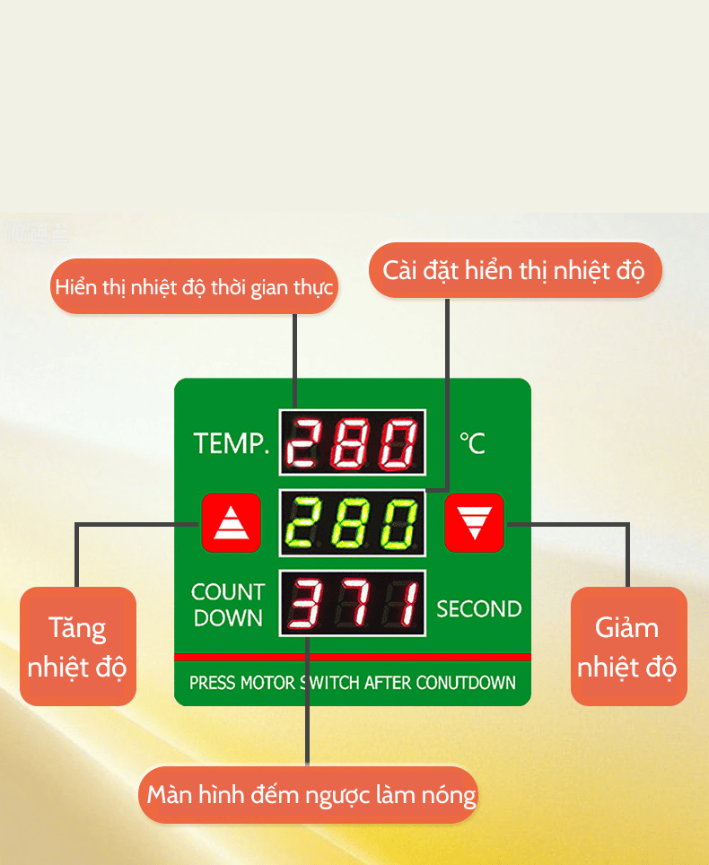 Màn hình điều khiển kỹ thuật số, hiển thị rõ ràng các thông số vận hành như nhiệt độ, thời gian – dễ dàng thao tác chỉ với vài nút bấm.