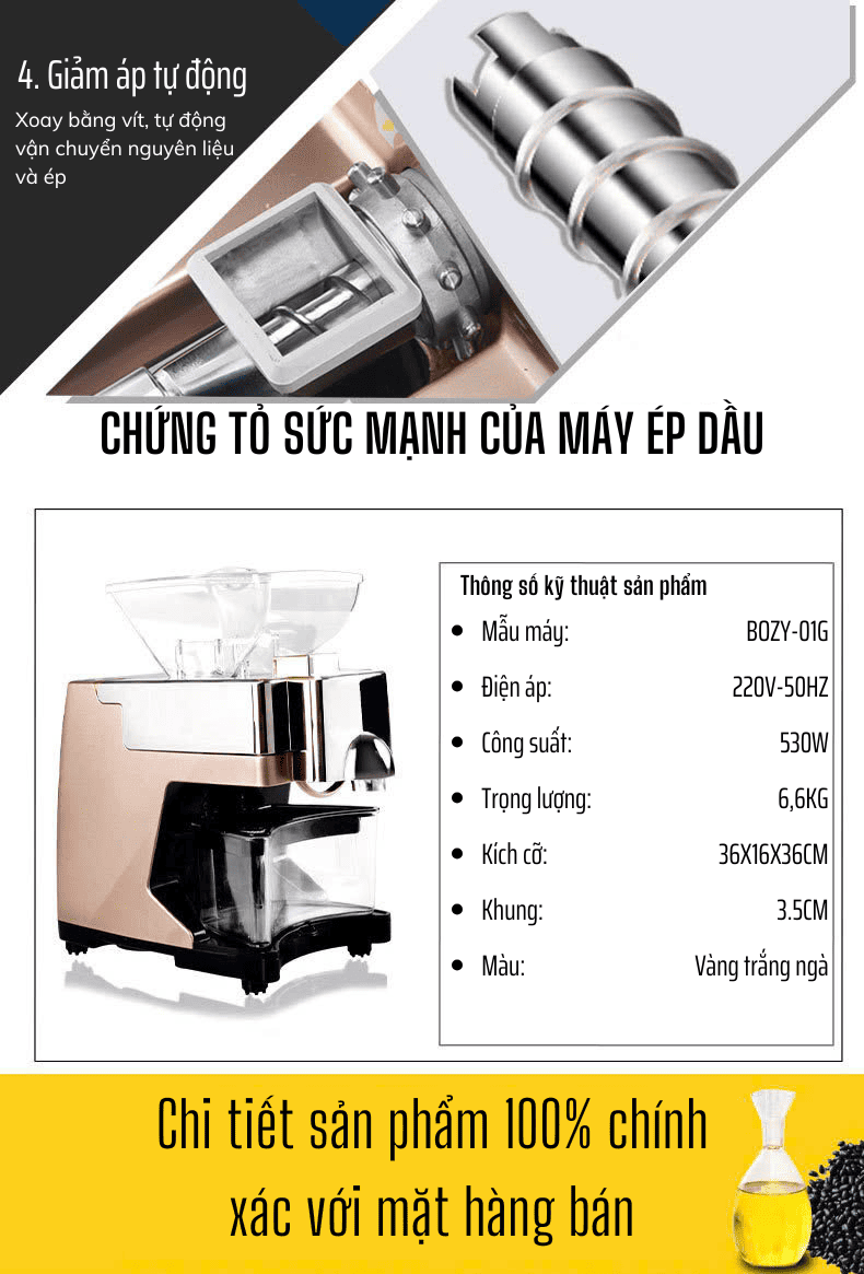 Máy ép dầu BOZY O1G là thiết bị nhỏ mà “có võ”, đáp ứng đầy đủ các tiêu chí: dễ dùng – gọn nhẹ – ép sạch – bền bỉ – tiết kiệm. Sản phẩm giúp bạn chủ động kiểm soát nguồn dầu ăn tại nhà, không còn lo ngại về dầu bẩn hay hóa chất trong thực phẩm.