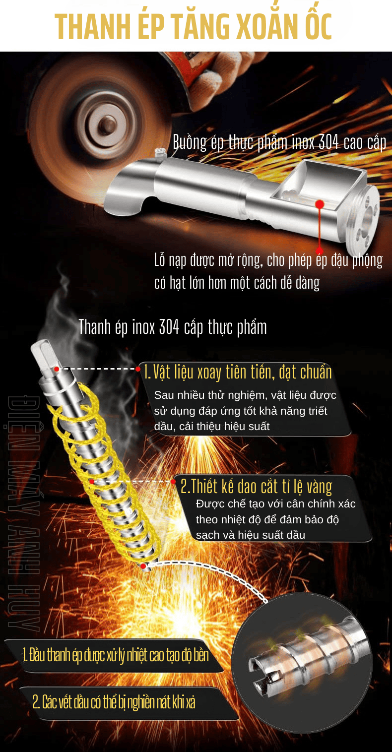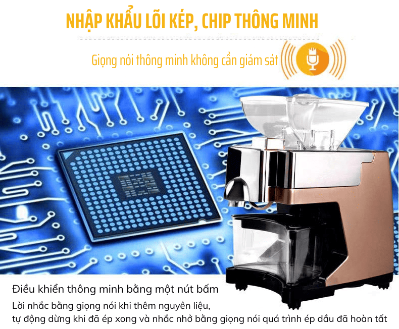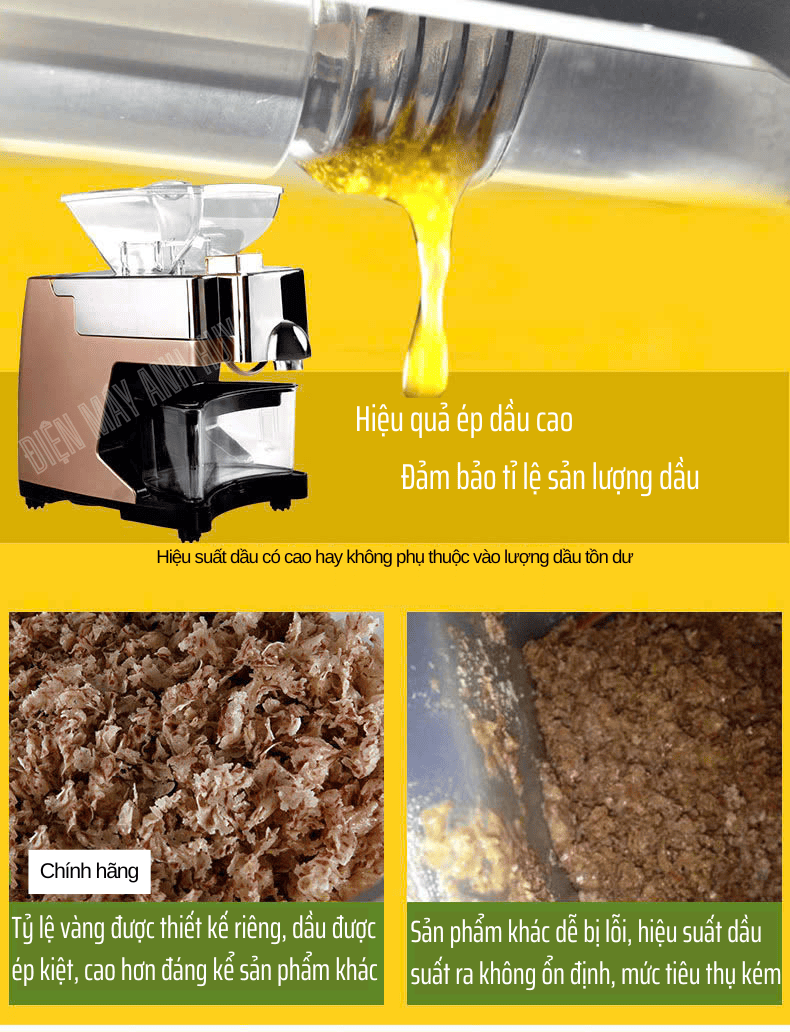 Máy sử dụng động cơ điện ổn định, vận hành êm ái, hạn chế tiếng ồn và rung lắc. Người dùng có thể dễ dàng điều chỉnh nhiệt độ từ 0 – 350°C tùy theo từng loại hạt, đảm bảo lượng dầu thu được luôn tinh khiết, không cháy, giữ được hương vị và dinh dưỡng nguyên bản.
