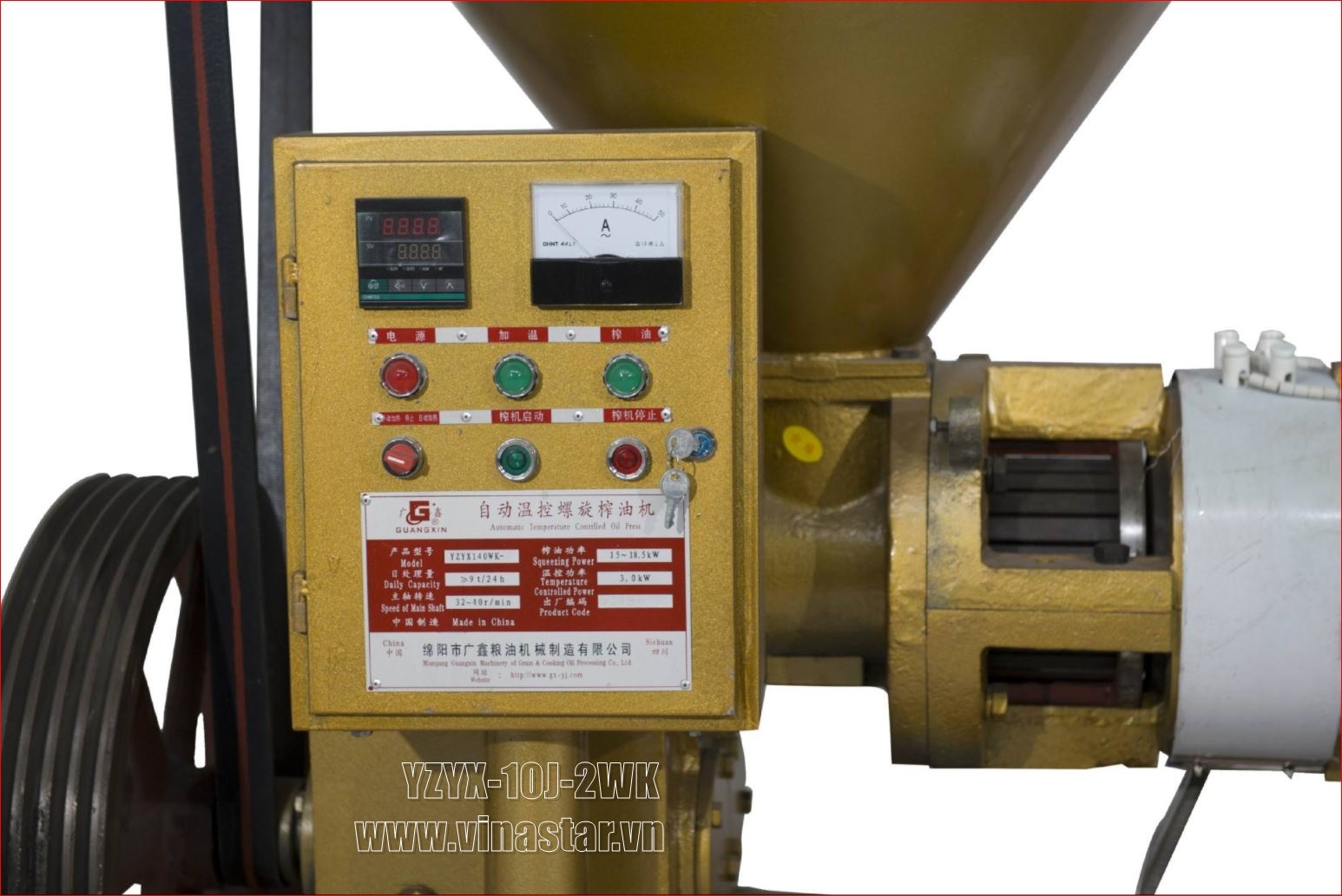 Máy ép dầu lạc YZYX140WK là loại máy ép có gia nhiệt, có bảng điện điều khiển nhiệt độ trục ép theo ý muốn người sử dụng. Đối với mỗi nguyên liệu khác nhau và tùy từng độ ẩm mà người dùng có thể điều chỉnh nhiệt độ cho phù hợp.