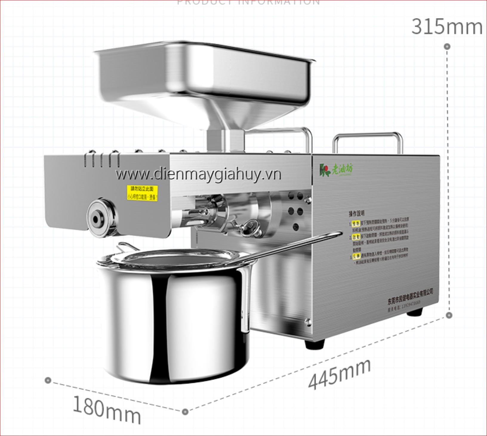 Máy ép dầu thực vật gia đình ED03 3-4KG/1HMáy ép dầu thực vật ED03 chuyên dùng để ép dầu thực vật từ các loại hạt cho các hộ gia đình, ngoài ra người sử dụng có thể dùng để ép nhiều loại dầu khác nhau như: lạc, vừng, óc chó, đỗ tương, dầu dừa, dầu gấc... Là sản phẩm có doanh thu cao nhất trong dòng máy ép dầu gia đình, hơn nữa đây là phiên bản xuất khẩu châu âu và mỹ nên bạn hoàn toàn có thể yên tâm về chất lượng máy, chế độ bảo hành, hay khi xảy ra sự cố hỏng hóc, sẽ có linh kiện từ nhà máy gửi về thay thế cho bạn trong thời gian sớm nhất. Chú ý: Các sản phẩm đem ép cần phơi thật khô rồi mới đem ép, đối với lạc phải rang qua cho chín khoảng 60-70%. Vừng, mè, óc chó, hạt mùi…không cần rang. Máy được người người tiêu dùng hết sức tin tưởng và sử dụng bởi giá cả hợp lý, chất lượng vượt trội, bền bỉ với chất liệu thiế kế bằng thép và iNox 304.