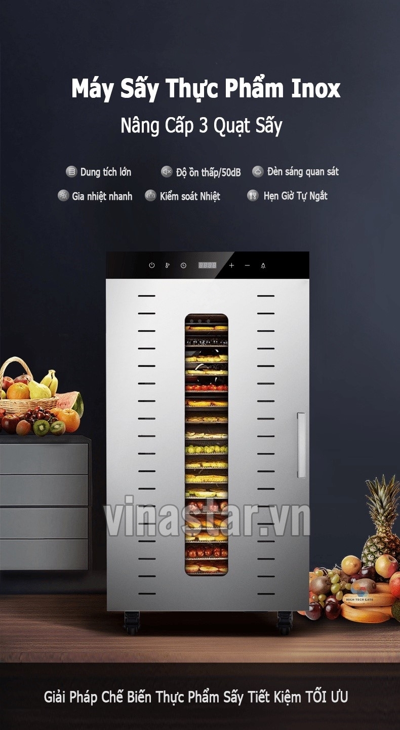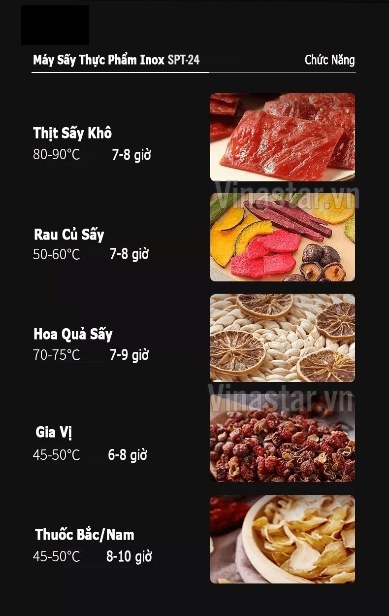 - Thời gian sấy hẹn giờ tự ngắt tối đa đến 24h. Tiện lợi đa dạng sấy các loại thực phẩm khác nhau