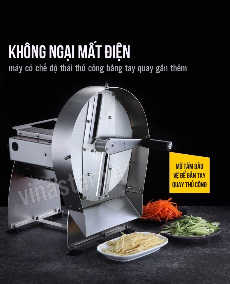 - Bổ sung chức năng quay tay: Ngoài chức năng chạy điện, máy thái rau củ có thêm tính năng quay thủ công để giúp bạn không bị gián đoạn công việc khi mất điện.